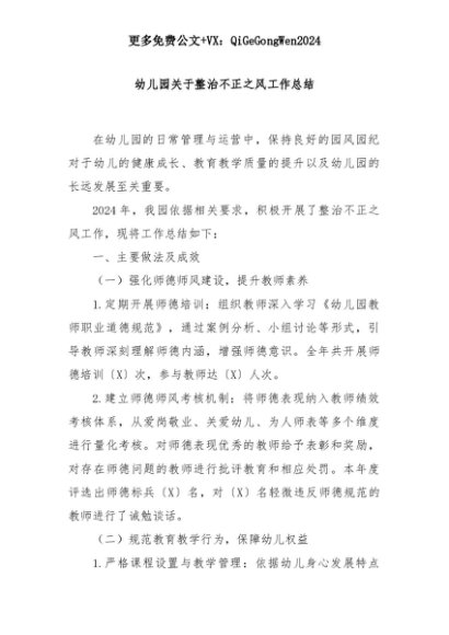 【七哥公文】2025年:幼儿园关于整治不正之风工作总结+更多免费公文+VX:QiGeGongWen2024+更多免费公文+VX:QiGeGongWen2024