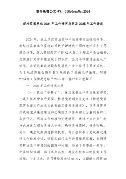 【七哥公文】2025年:纪检监察单位2024年工作情况总结及2025年工作计划+更多免费公文+VX:QiGeGongWen2024+更多免费公文+VX:QiGeGongWen2024