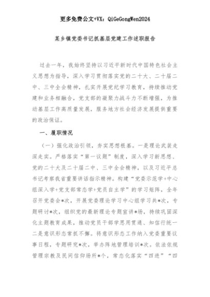 【七哥公文】2025年:某乡镇党委书记抓基层党建工作述职报告+更多免费公文+VX:QiGeGongWen2024+更多免费公文+VX:QiGeGongWen2024