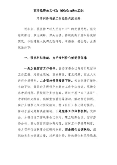 【七哥公文】2025年:矛盾纠纷调解工作经验交流材料+更多免费公文+VX:QiGeGongWen2024+更多免费公文+VX:QiGeGongWen2024