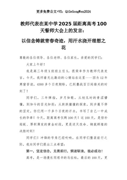 【七哥公文】2025年:教师代表在某中学2025届距离高考100天誓师大会上的发言:以信念铸就青春奇迹,用汗水浇开理想之花+更多免费公文+VX:QiGeGongWen2024+更多免费公文+VX:QiGeGongWen2024