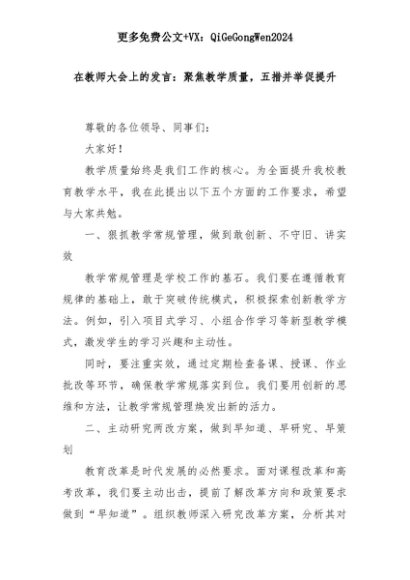【七哥公文】2025年:在教师大会上的发言:聚焦教学质量,五措并举促提升+更多免费公文+VX:QiGeGongWen2024+更多免费公文+VX:QiGeGongWen2024