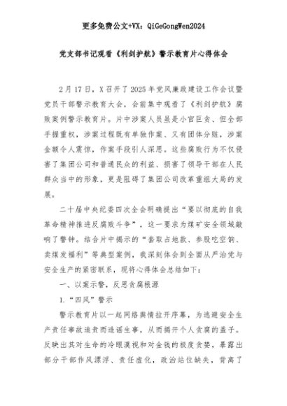【七哥公文】2025年:党支部书记观看《利剑护航》警示教育片心得体会+更多免费公文+VX:QiGeGongWen2024+更多免费公文+VX:QiGeGongWen2024