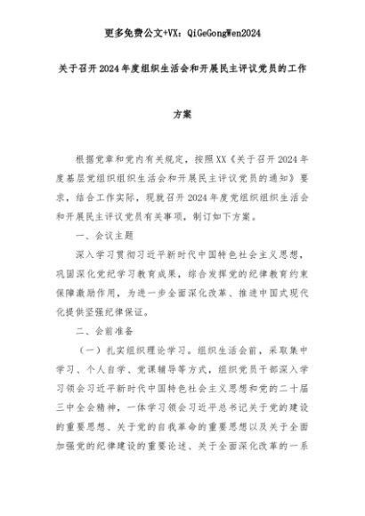 【七哥公文】2025年:关于召开2024年度组织生活会和开展民主评议党员的工作方案+更多免费公文+VX:QiGeGongWen2024+更多免费公文+VX:QiGeGongWen2024