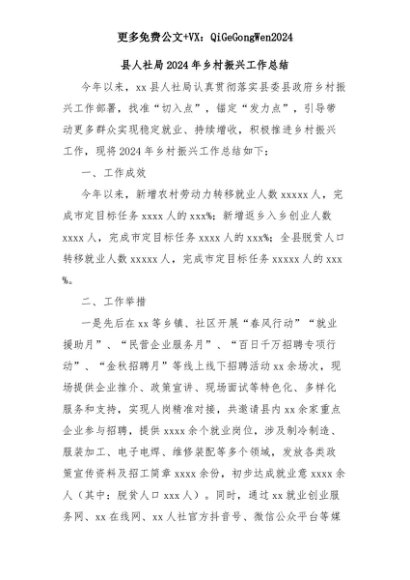 【七哥公文】2025年:县人社局2024年乡村振兴工作总结+更多免费公文+VX:QiGeGongWen2024+更多免费公文+VX:QiGeGongWen2024