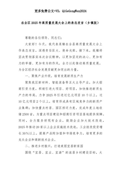 【七哥公文】2025年:在全区2025年高质量发展大会上的表态发言(乡镇版)+更多免费公文+VX:QiGeGongWen2024+更多免费公文+VX:QiGeGongWen2024