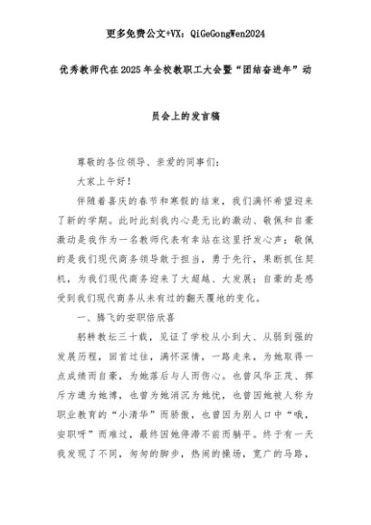 【七哥公文】2025年:优秀教师代在2025年全校教职工大会暨“团结奋进年”动员会上的发言稿+更多免费公文+VX:QiGeGongWen2024+更多免费公文+VX:QiGeGongWen2024