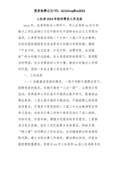 【七哥公文】2025年:人社局2024年驻村帮扶工作总结+更多免费公文+VX:QiGeGongWen2024+更多免费公文+VX:QiGeGongWen2024
