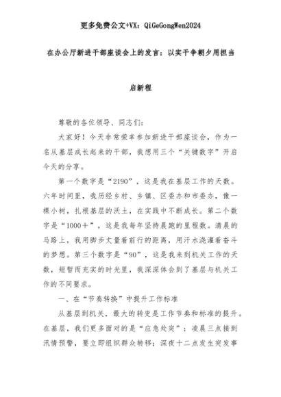 【七哥公文】2025年:在办公厅新进干部座谈会上的发言:以实干争朝夕用担当启新程+更多免费公文+VX:QiGeGongWen2024+更多免费公文+VX:QiGeGongWen2024