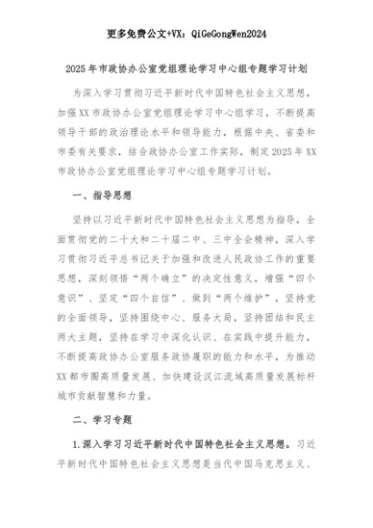 【七哥公文】2025年:2025年市政协办公室党组理论学习中心组专题学习计划+更多免费公文+VX:QiGeGongWen2024+更多免费公文+VX:QiGeGongWen2024