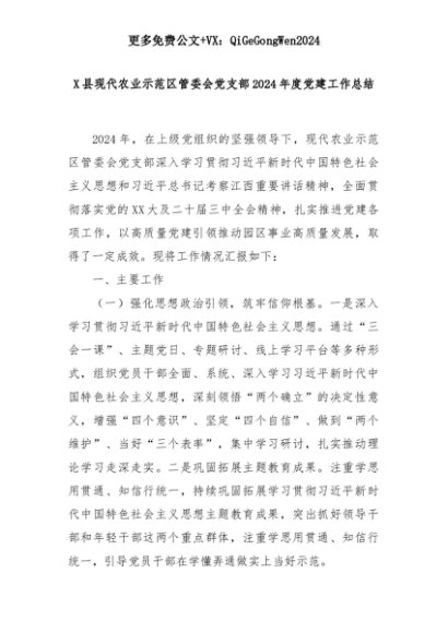 【七哥公文】2025年:X县现代农业示范区管委会党支部2024年度党建工作总结+更多免费公文+VX:QiGeGongWen2024+更多免费公文+VX:QiGeGongWen2024