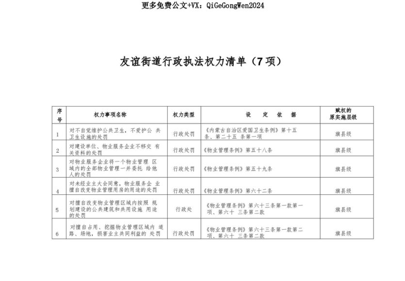 【七哥公文】2025年:xx街道行政执法权力清单(7项)+更多免费公文+VX:QiGeGongWen2024+更多免费公文+VX:QiGeGongWen2024