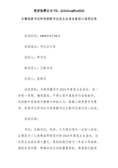 【七哥公文】2025年:乡镇党委书记和党委副书记民主生活会前谈心谈话记录+更多免费公文+VX:QiGeGongWen2024+更多免费公文+VX:QiGeGongWen2024