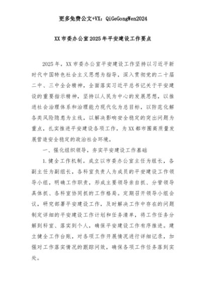 【七哥公文】2025年:XX市委办公室2025年平安建设工作要点+更多免费公文+VX:QiGeGongWen2024+更多免费公文+VX:QiGeGongWen2024