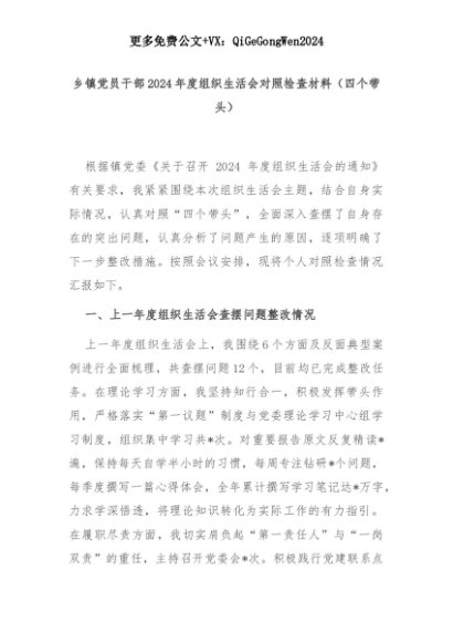 【七哥公文】2025年:乡镇党员干部2024年度组织生活会对照检查材料(四个带头)+更多免费公文+VX:QiGeGongWen2024+更多免费公文+VX:QiGeGongWen2024