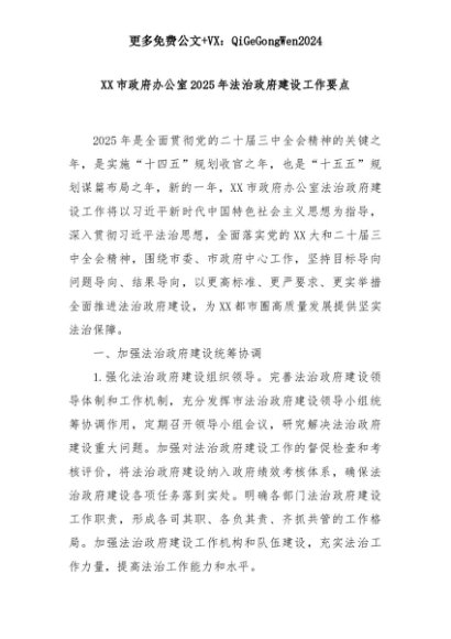 【七哥公文】2025年:XX市政府办公室2025年法治政府建设工作要点+更多免费公文+VX:QiGeGongWen2024+更多免费公文+VX:QiGeGongWen2024
