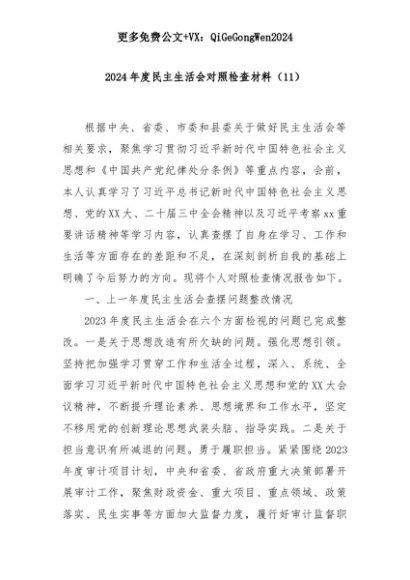 【七哥公文】2025年:2024年度民主生活会对照检查材料(11)+更多免费公文+VX:QiGeGongWen2024+更多免费公文+VX:QiGeGongWen2024