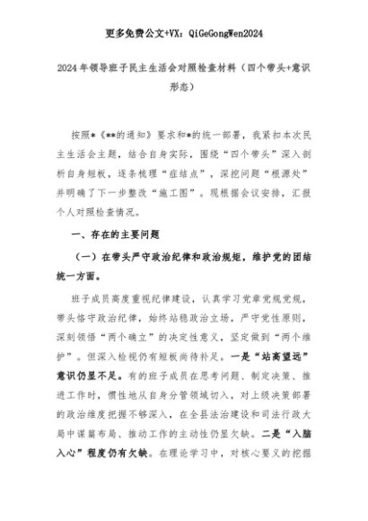 【七哥公文】2025年:2024年领导班子民主生活会对照检查材料(四个带头+意识形态)+更多免费公文+VX:QiGeGongWen2024+更多免费公文+VX:QiGeGongWen2024