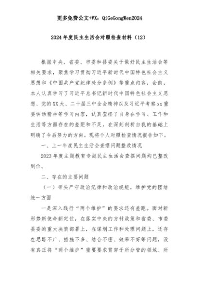 【七哥公文】2025年:2024年度民主生活会对照检查材料(12)+更多免费公文+VX:QiGeGongWen2024+更多免费公文+VX:QiGeGongWen2024