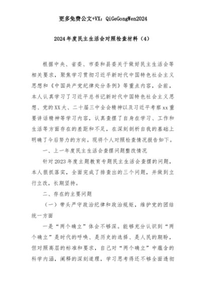 【七哥公文】2025年:2024年度民主生活会对照检查材料(4)+更多免费公文+VX:QiGeGongWen2024+更多免费公文+VX:QiGeGongWen2024