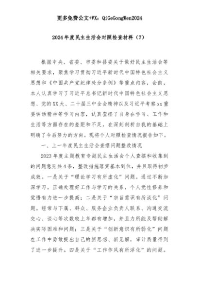 【七哥公文】2025年:2024年度民主生活会对照检查材料(7)+更多免费公文+VX:QiGeGongWen2024+更多免费公文+VX:QiGeGongWen2024