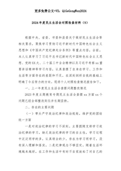 【七哥公文】2025年:2024年度民主生活会对照检查材料(9)+更多免费公文+VX:QiGeGongWen2024+更多免费公文+VX:QiGeGongWen2024