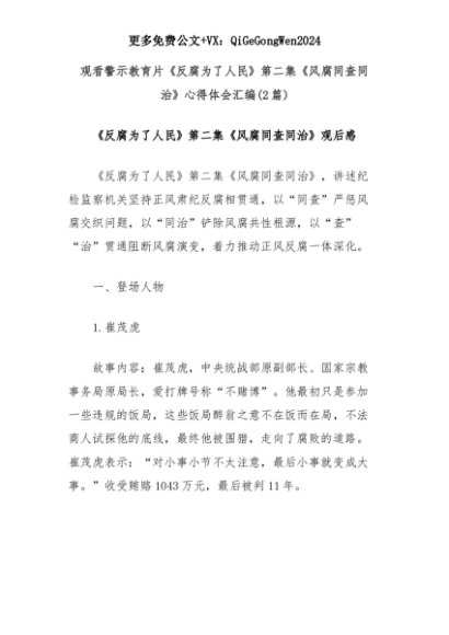 【七哥公文】2025年:(2篇)观看警示教育片《反腐为了人民》第二集《风腐同查同治》心得体会汇编+更多免费公文+VX:QiGeGongWen2024+更多免费公文+VX:QiGeGongWen2024