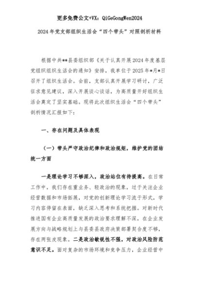 【七哥公文】2025年:2024年党支部组织生活会“四个带头”对照剖析材料+更多免费公文+VX:QiGeGongWen2024+更多免费公文+VX:QiGeGongWen2024