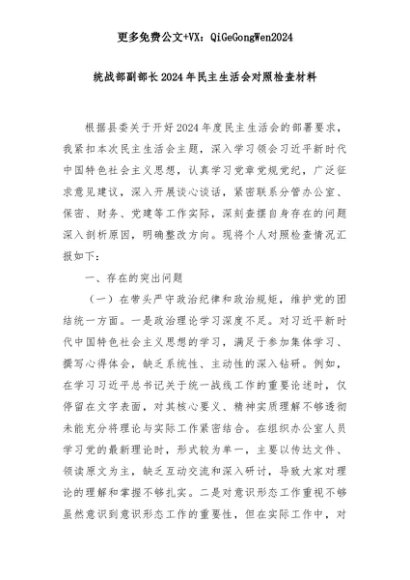 【七哥公文】2025年:统战部副部长2024年民主生活会对照检查材料+更多免费公文+VX:QiGeGongWen2024+更多免费公文+VX:QiGeGongWen2024