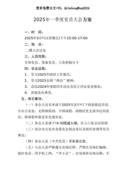 【七哥公文】2025年:03-2025年一季度党员大会方案(3月版)+更多免费公文+VX:QiGeGongWen2024+更多免费公文+VX:QiGeGongWen2024