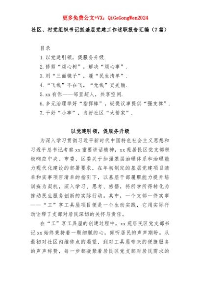 【七哥公文】2025年:(7篇)社区、村党组织书记抓基层党建工作述职报告汇编+更多免费公文+VX:QiGeGongWen2024+更多免费公文+VX:QiGeGongWen2024