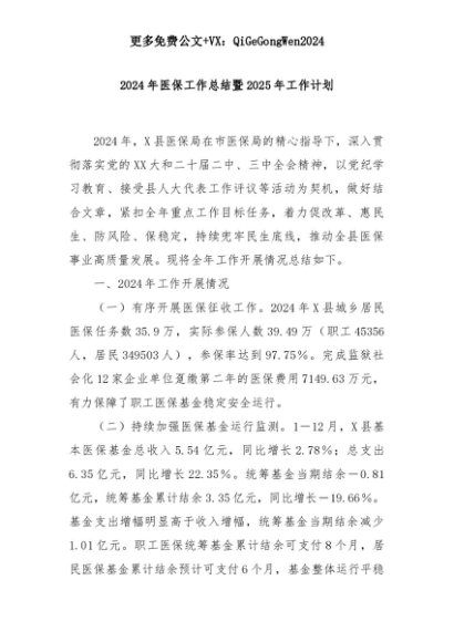 【七哥公文】2025年:2024年医保工作总结暨2025年工作计划+更多免费公文+VX:QiGeGongWen2024+更多免费公文+VX:QiGeGongWen2024