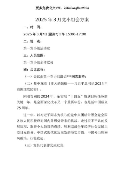 【七哥公文】2025年:02-2025年3月党小组会方案+更多免费公文+VX:QiGeGongWen2024+更多免费公文+VX:QiGeGongWen2024