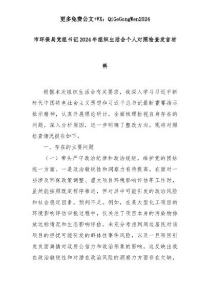 【七哥公文】2025年:市环保局党组书记2024年组织生活会个人对照检查发言材料+更多免费公文+VX:QiGeGongWen2024+更多免费公文+VX:QiGeGongWen2024