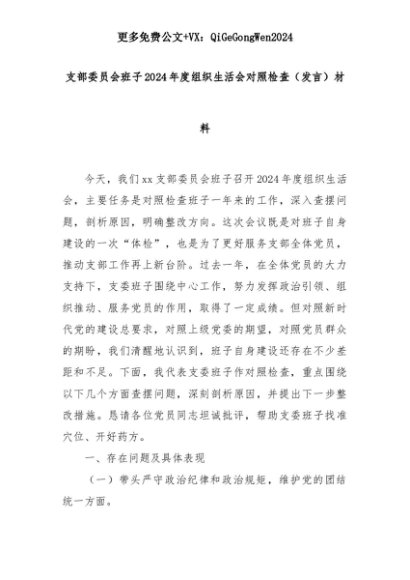 【七哥公文】2025年:支部委员会班子2024年度组织生活会对照检查(发言)材料+更多免费公文+VX:QiGeGongWen2024+更多免费公文+VX:QiGeGongWen2024