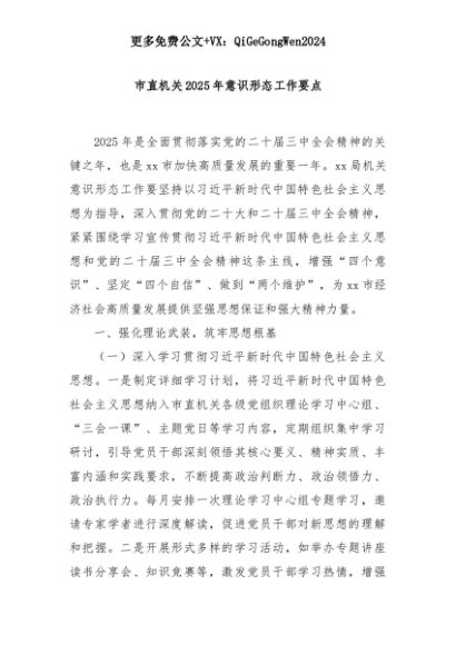 【七哥公文】2025年:市直机关2025年意识形态工作要点+更多免费公文+VX:QiGeGongWen2024+更多免费公文+VX:QiGeGongWen2024