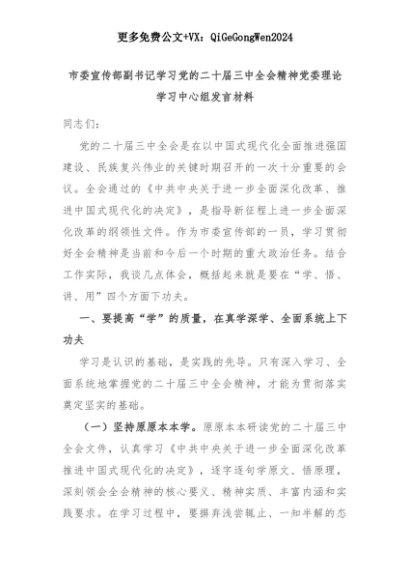 【七哥公文】2025年:市委宣传部副书记学习党的二十届三中全会精神党委理论学习中心组发言材料+更多免费公文+VX:QiGeGongWen2024+更多免费公文+VX:QiGeGongWen2024
