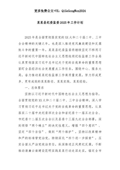 【七哥公文】2025年:某某县纪委监委2025年工作计划+更多免费公文+VX:QiGeGongWen2024+更多免费公文+VX:QiGeGongWen2024