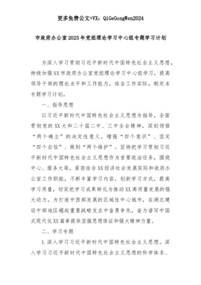 【七哥公文】2025年:市政府办公室2025年党组理论学习中心组专题学习计划+更多免费公文+VX:QiGeGongWen2024+更多免费公文+VX:QiGeGongWen2024