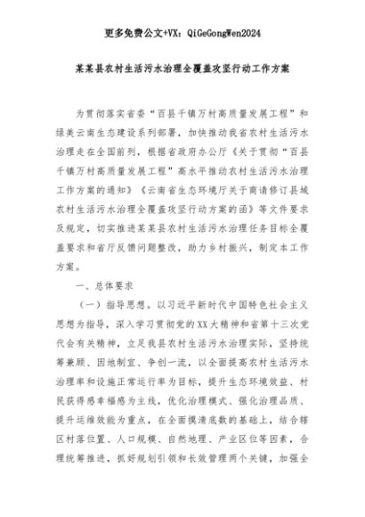 【七哥公文】2025年:某某县农村生活污水治理全覆盖攻坚行动工作方案+更多免费公文+VX:QiGeGongWen2024+更多免费公文+VX:QiGeGongWen2024
