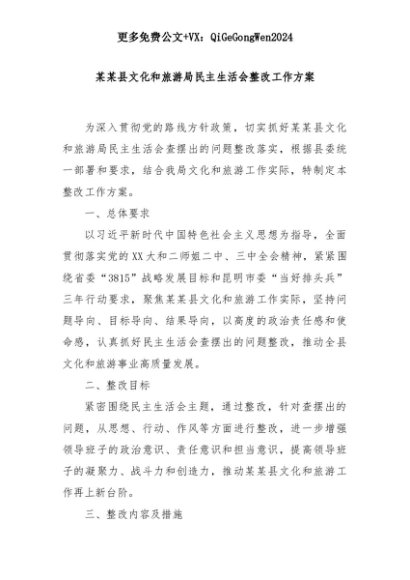 【七哥公文】2025年:某某县文化和旅游局民主生活会整改工作方案+更多免费公文+VX:QiGeGongWen2024+更多免费公文+VX:QiGeGongWen2024