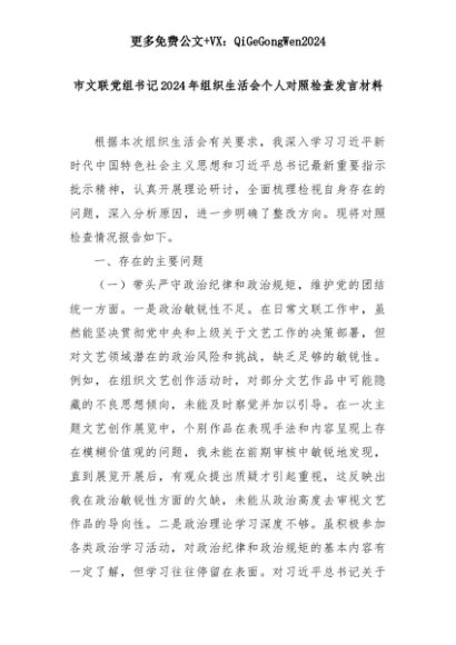 【七哥公文】2025年:市文联党组书记2024年组织生活会个人对照检查发言材料+更多免费公文+VX:QiGeGongWen2024+更多免费公文+VX:QiGeGongWen2024