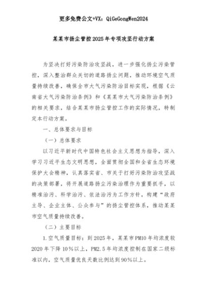 【七哥公文】2025年:某某市扬尘管控2025年专项攻坚行动方案+更多免费公文+VX:QiGeGongWen2024+更多免费公文+VX:QiGeGongWen2024