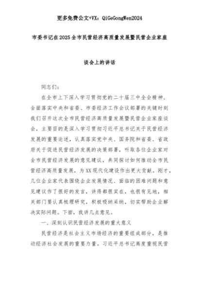 【七哥公文】2025年:市委书记在2025全市民营经济高质量发展暨民营企业家座谈会上的讲话+更多免费公文+VX:QiGeGongWen2024+更多免费公文+VX:QiGeGongWen2024