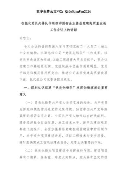 【七哥公文】2025年:在强化党员先锋队作用推动国有企业基层党建高质量发展工作会议上的讲话+更多免费公文+VX:QiGeGongWen2024+更多免费公文+VX:QiGeGongWen2024
