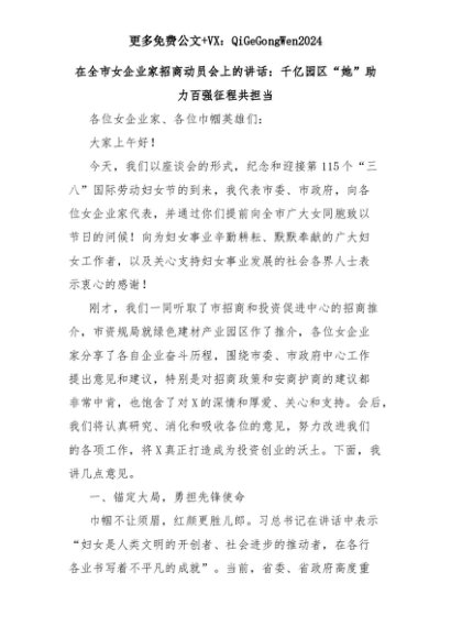 【七哥公文】2025年:在全市女企业家招商动员会上的讲话:千亿园区“她”助力百强征程共担当+更多免费公文+VX:QiGeGongWen2024+更多免费公文+VX:QiGeGongWen2024