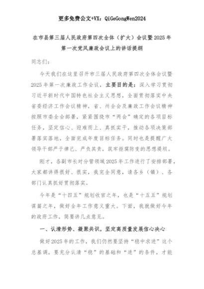 【七哥公文】2025年:在市县第三届人民政府第四次全体(扩大)会议暨2025年第一次党风廉政会议上的讲话提纲+更多免费公文+VX:QiGeGongWen2024+更多免费公文+VX:QiGeGongWen2024
