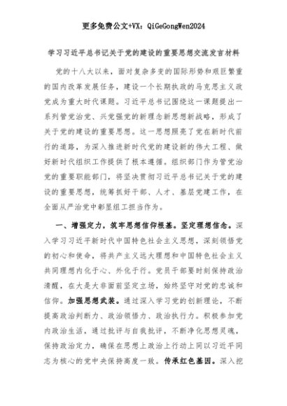 【七哥公文】2025年:学习习近平总书记关于党的建设的重要思想交流发言材料+更多免费公文+VX:QiGeGongWen2024+更多免费公文+VX:QiGeGongWen2024