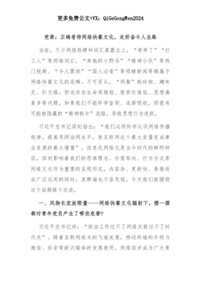 【七哥公文】2025年:党课:正确看待网络快餐文化,走好奋斗人生路+更多免费公文+VX:QiGeGongWen2024+更多免费公文+VX:QiGeGongWen2024