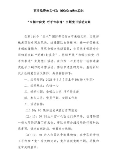 【七哥公文】2025年:“巾帼心向党 巧手传非遗”主题党日活动方案+更多免费公文+VX:QiGeGongWen2024+更多免费公文+VX:QiGeGongWen2024